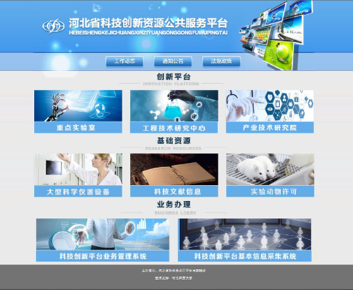 2015年12月15日,由科技廳設(shè)計開發(fā)的“河北省科技創(chuàng)新資源公共服務(wù)平臺”網(wǎng)站正式開通。該網(wǎng)站作為河北省科學(xué)技術(shù)廳廳網(wǎng)下屬二級網(wǎng)站,以科技創(chuàng)新平臺和科技創(chuàng)新資源統(tǒng)籌為重點,系統(tǒng)整合了省級以上重點實驗室、工程技術(shù)研究中心、產(chǎn)業(yè)技術(shù)研究院、大型科學(xué)儀器設(shè)備共享服務(wù)、科技文獻(xiàn)服務(wù)、實驗動物行政許可等分散在不同工作體系的服務(wù)功能和相關(guān)信息,集中公開展示科技創(chuàng)新平臺工作動態(tài)、通知公告、政策法規(guī)和已建重點實驗室、工程技術(shù)研究中心、產(chǎn)業(yè)技術(shù)研究院基本信息及實驗動物生產(chǎn)許可、使用許可信息,并鏈接河北省大型科學(xué)儀器資源共享服務(wù)聯(lián)盟、科技文獻(xiàn)服務(wù)網(wǎng)和科技創(chuàng)新平臺業(yè)務(wù)管理系統(tǒng)。